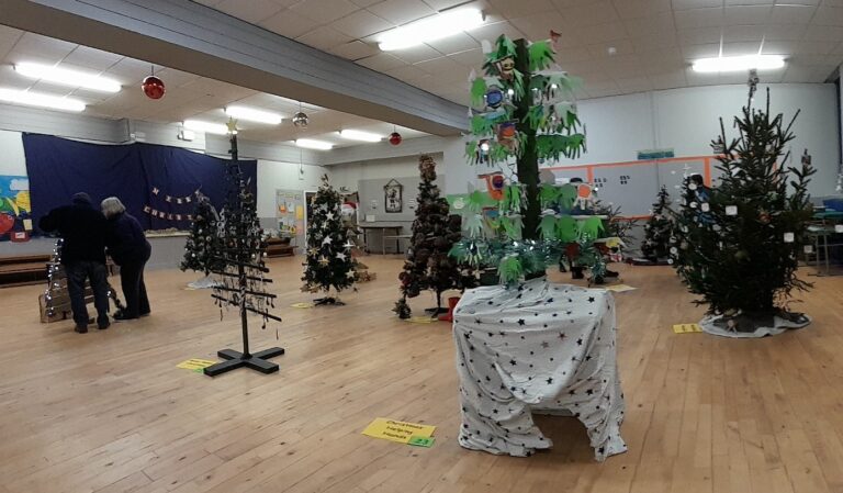 Some of the trees in the Stanley Primary School Christmas Tree Festival, various contributors inc. WSWG.