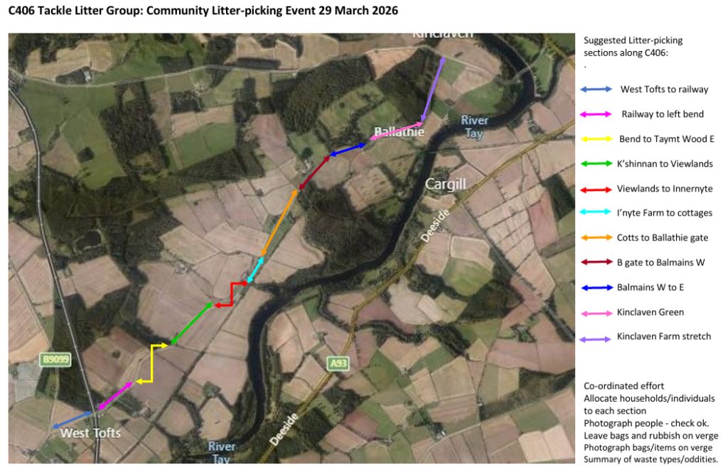 Sunday 29 March 11am–4pm: WSWG participation in C406 annual Community Litterpick – do get in touch if you’d like to help or just turn up on the day. You can borrow litter-picking equipment and get black bags, gloves and hi-vis vests at the Innernyte Farmhouse HQ! We have also arranged with PKC for the road to be closed for the duration for the safety of the litter-pickers and the rubbish to be collected on the day. Will there be more or fewer black bags filled than last year?